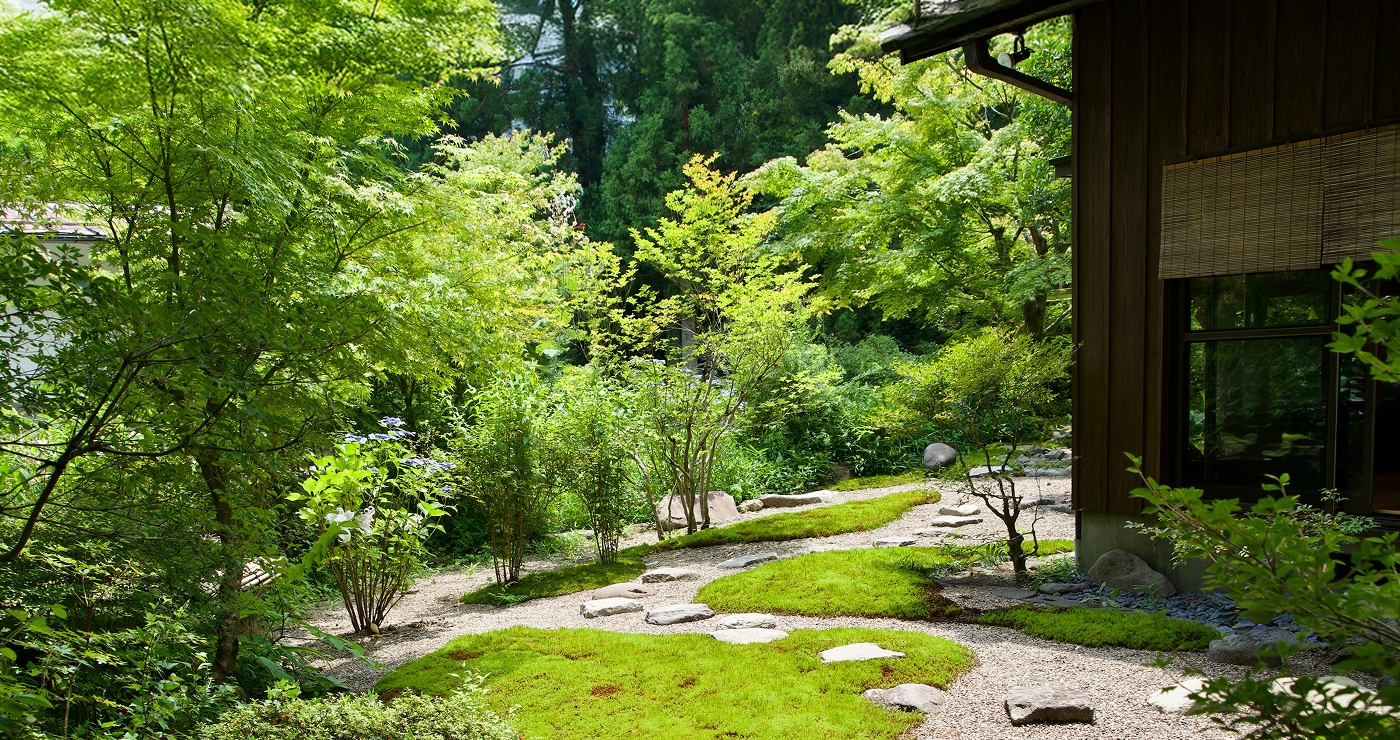 美しさを兼ね備え、思わず立ち寄りたくなる、自然と足を運んでいる場所となるようなお庭づくりを徹底して取り組みます。万葉の奏でる店庭づくりは庭師九右衛門の使命です。