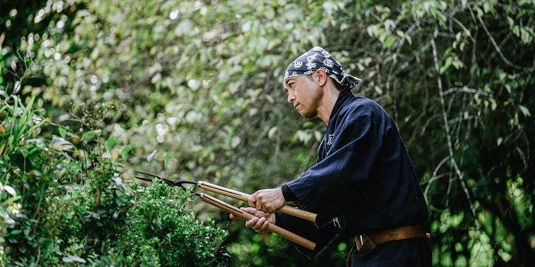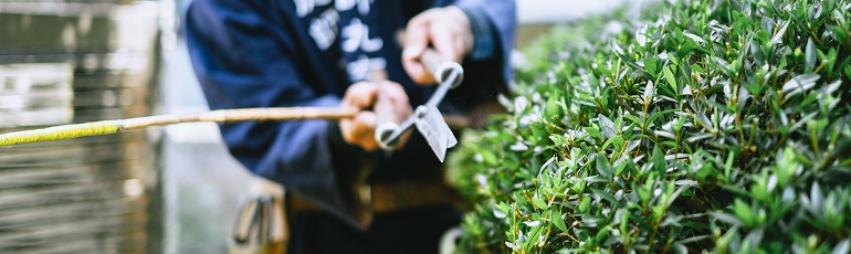 花木-たとえば、しだれ梅やつつじなどは花を咲かせたあとが剪定のタイミングです。大切な花芽を切り落としてしまわないよう、やさしく枝を整えます。 -